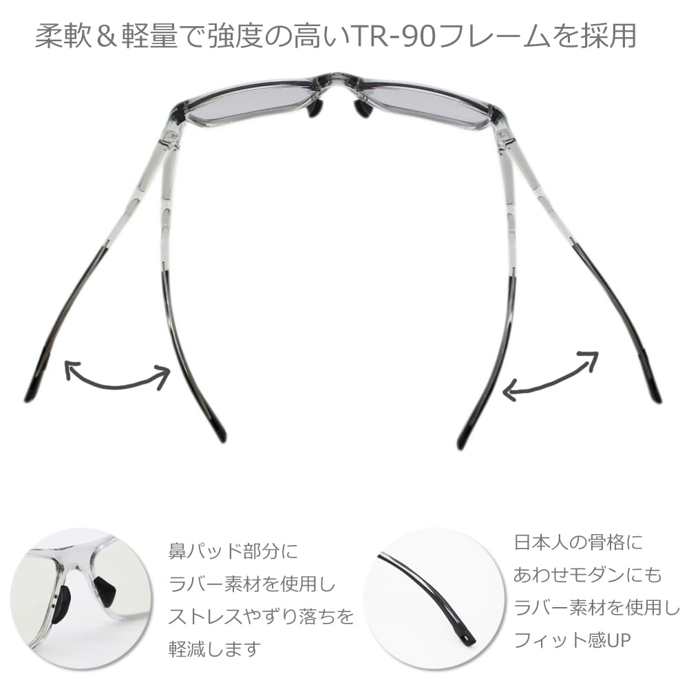 フレームには宇宙開発でも使用される柔軟性と強度を兼ね備えた素材TR-90を使用。男女兼用のおしゃれなフレームです。日本人の骨格に合わせて設計したフレームの為、フィット感抜群!軽量設計で長時間かけても負担が少なく、ズレにくいのが特徴です。